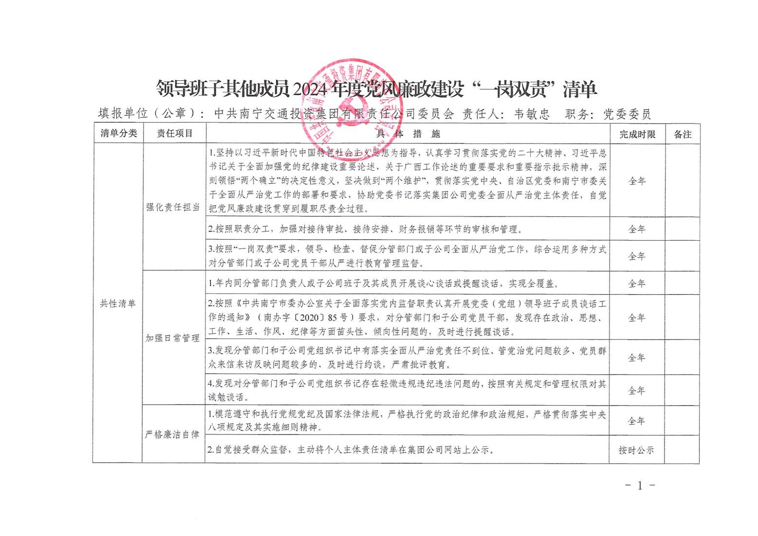 領(lǐng)導(dǎo)班子其他成員2024年度黨風廉政建設(shè)“一崗雙責”清單(八)