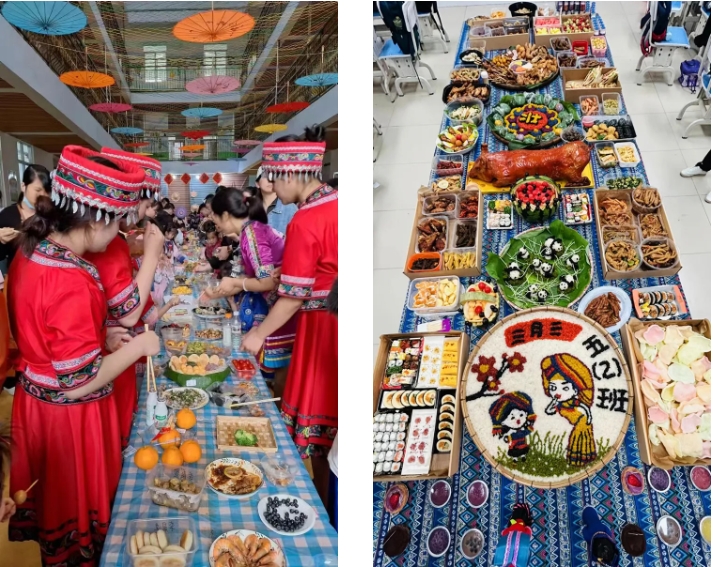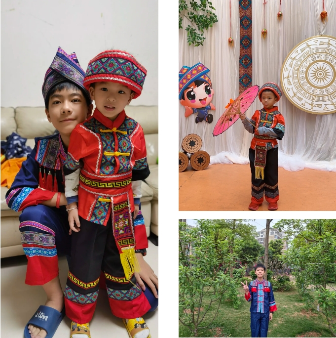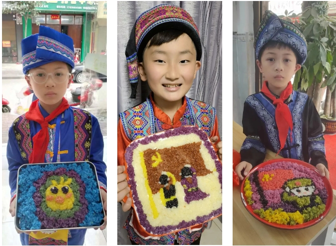 “長桌宴”又稱合攏宴,是侗族、苗族、瑤族等多個民族的風(fēng)俗習(xí)慣,常用于接親嫁女、滿月酒、村寨聯(lián)誼等宴飲活動,代表最為隆重的待客禮俗,已有幾千年歷史。“長桌宴”上有壯族特色的五色糯米飯、艾葉糍粑、壯粽,苗族的傳統(tǒng)佳肴,還有黎族的三色飯……一份份美食造型美觀、色彩鮮艷、香味撲鼻。圖為集團職工拍攝的孩子參加學(xué)校“三月三”活動。