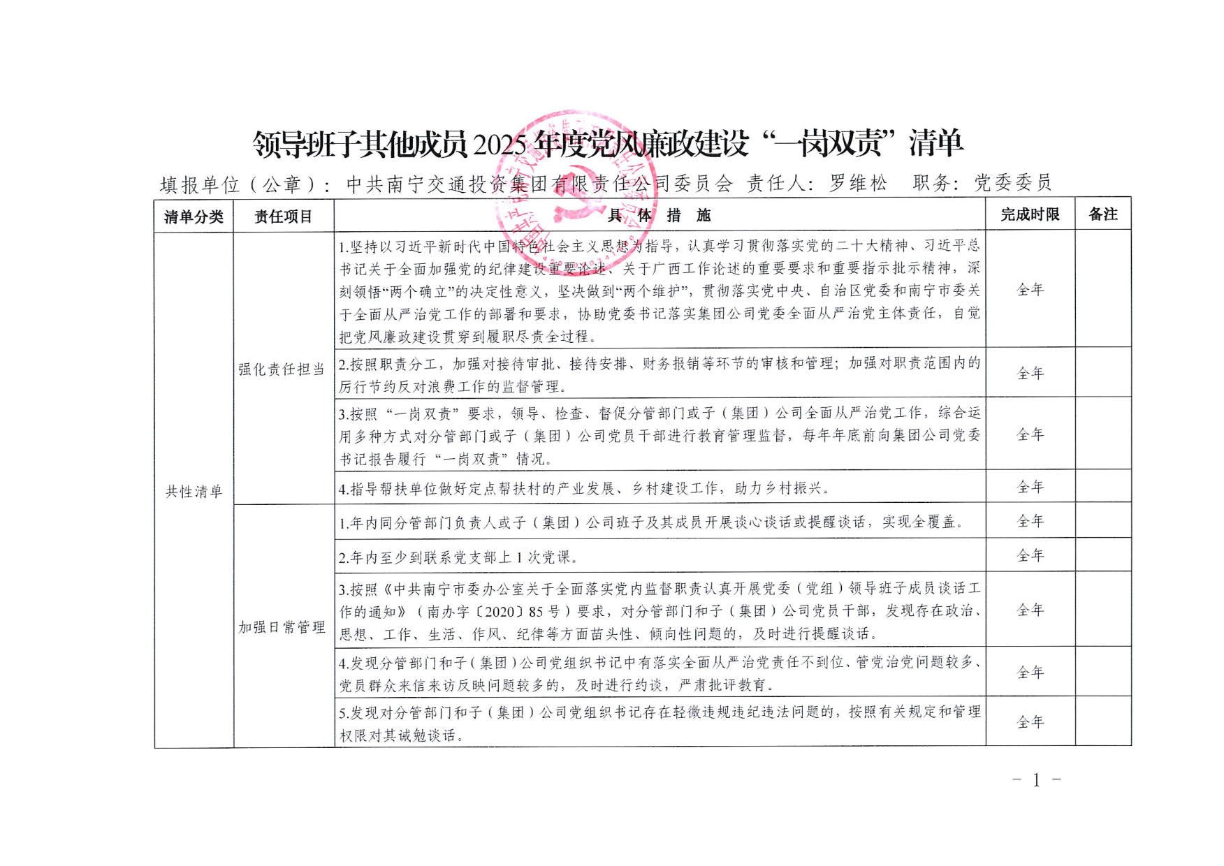 南寧交投集團領(lǐng)導班子其他成員2025年度黨風廉政建設(shè)“一崗雙責”清單(五)